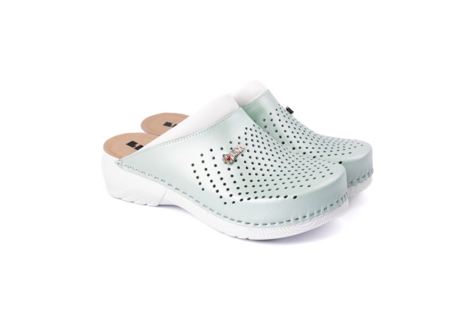 Ženska klompa izrađena od prirodne kože sa ventilirajućim rupicama i kožnom tabanicom, koja sadrži masažni gel. Đon je napravljen od poliuretanske mase koji sadrži anti–slip čep, koji sprečava klizanje.