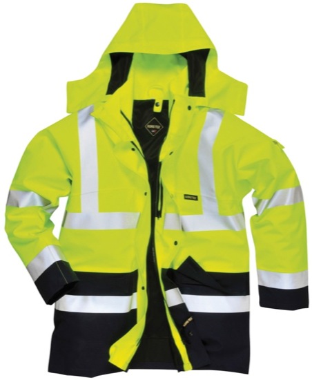OSOBINE- Opis:Jakna zimska fluorescentna sa reflektujućim trakama,žuta/teget, otporna na kišu i vetar sa kapuljačom, materijal 100% poliester